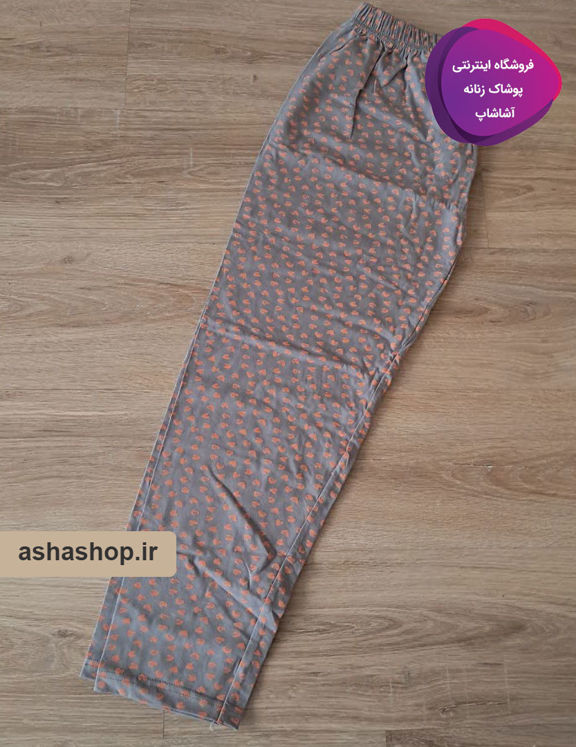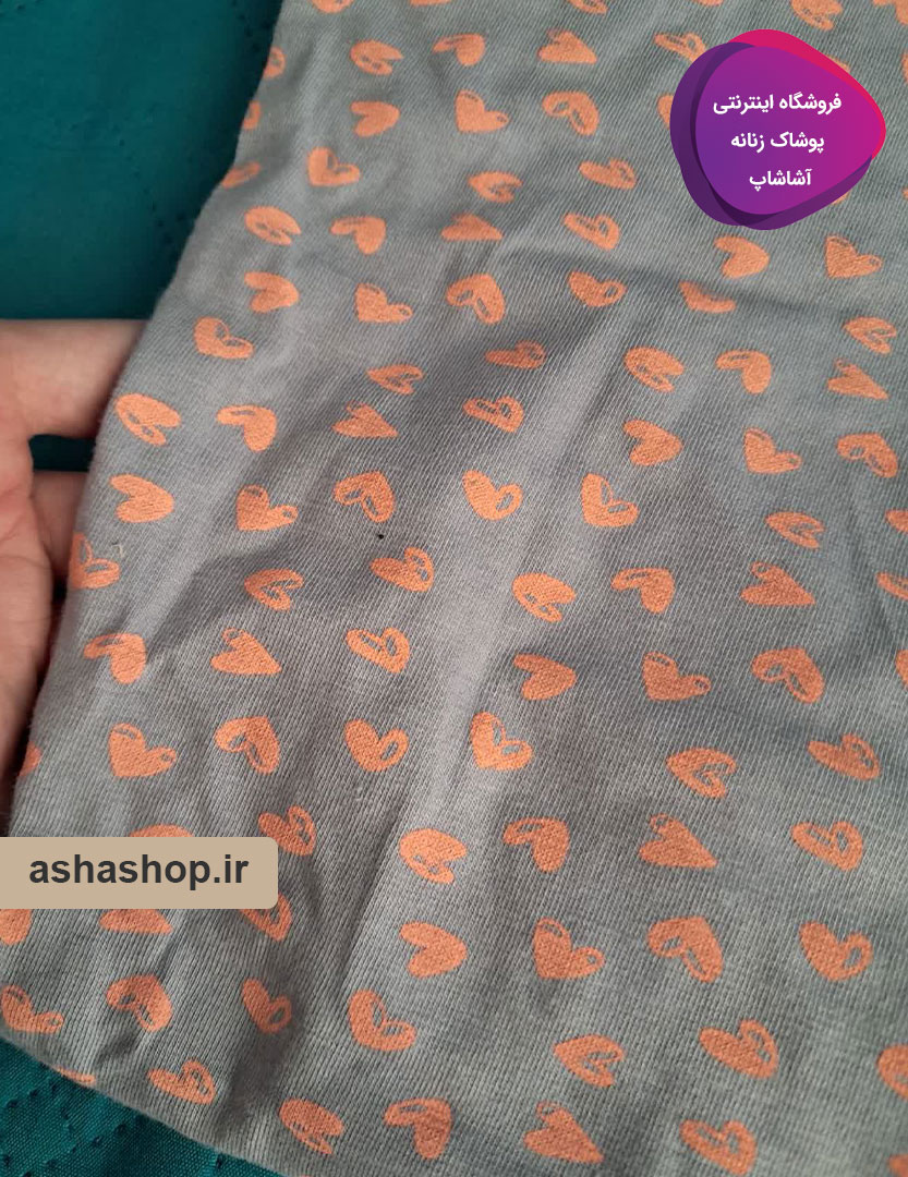 رنگ و طرح: زمینه اصلی شلوار طوسی است که با طرح‌های مینیاتوری قلب به رنگ نارنجی یا هلویی تزئین شده است. ترکیب رنگ طوسی خنثی با طرح شاداب، ظاهری مدرن و دوست‌داشتنی به شلوار داده است.