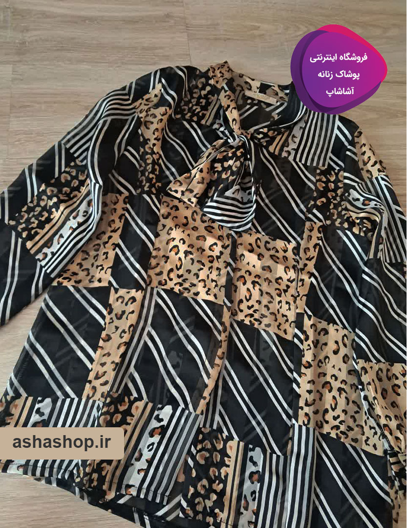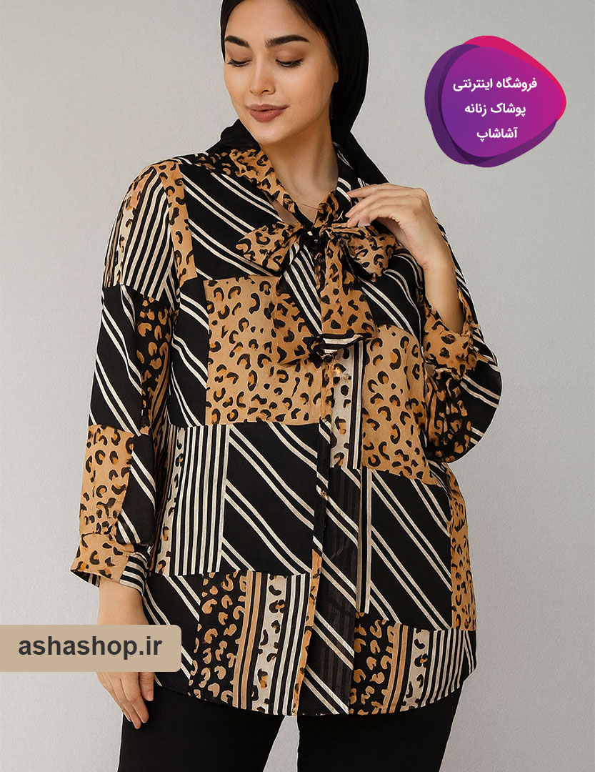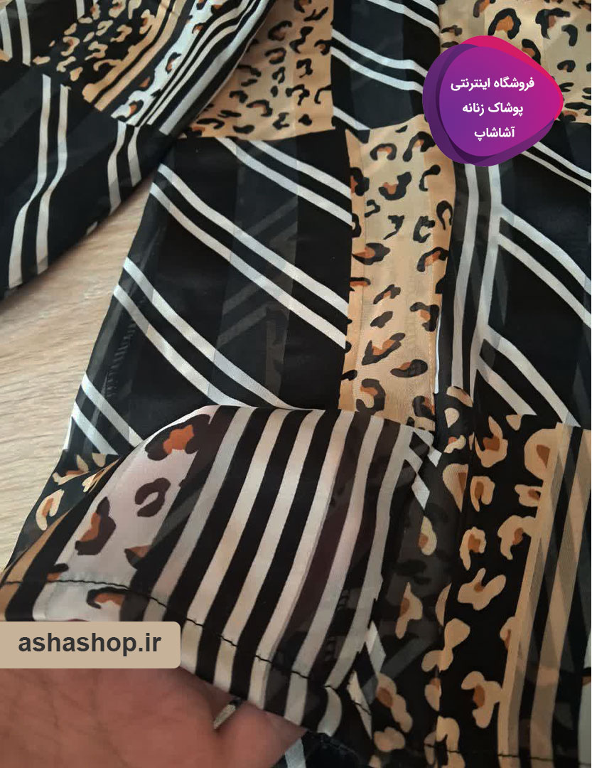 طرح آذرین با ترکیب هوشمندانه نقوش پلنگی (Animal Print) و خطوط هندسی مورب، تضاد جذابی ایجاد کرده که از تکرار و یکنواختی به دور است. رنگ زمینه مشکی در کنار طیفهای طلایی و کرم، حسی از لوکس بودن را القا میکند. یقه کراواتی این مدل، این امکان را به شما میدهد که با بستن یک پاپیون ظریف، استایلی کلاسیک و زنانه داشته باشید یا با رها کردن بندها، حالتی کژوال و مدرن به خود بگیرید.